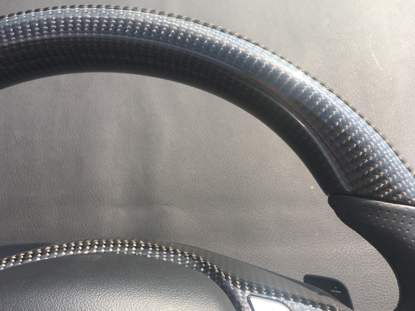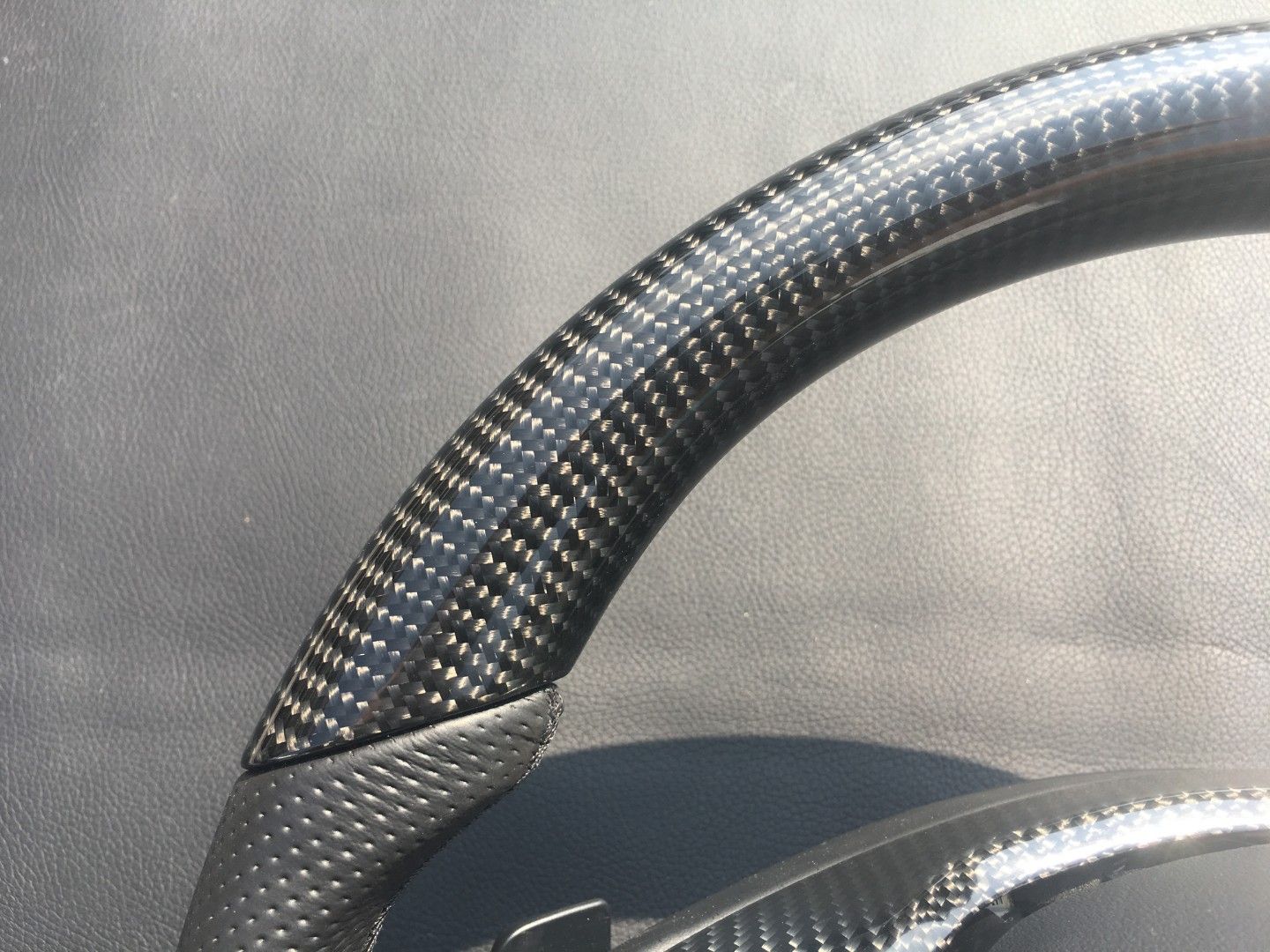 - Materials: high-grade carbon fiber top, bottom and center, black perforated genuine leather on the sides.